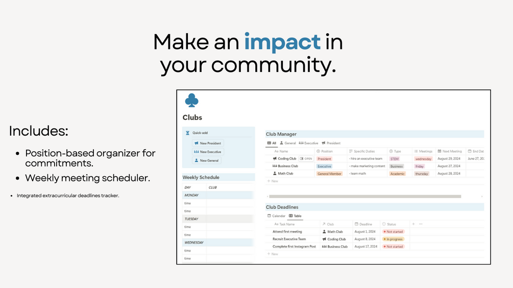 Have IMPACTFUL extracurricular positions with the Club Manager! Effectively track all of your positions, responsibilities and meetings.