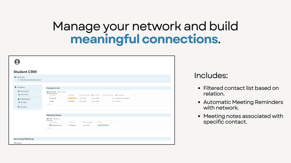 Organize all of your contacts in this Student CRM! Rate all of your contacts from 1 to 5 stars and prioritize those who matter.